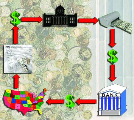 Como se mostra no diagrama anterior os responsáveis estabeleceram um sistema económico simples que não se baseou num banco central privado. Emitido pelo governo o dinheiro passou a circular e a ser usado publicamente sem cobrança de juros. Durante o circuito de trocas económicas o Estado cobrava os respectivos impostos e aceitava de novo o dinheiro sob a forma de depósitos num banco estatal. Por cada ano fiscal a quantidade de dinheiro emitido igualava a soma do dinheiro colectado. Nada se perdia. O dólar baseava-se numa medida de peso em prata, o que significa um valor do dólar fixo e não sujeito aos caprichos gananciosos dos governantes ou dos banqueiros3. O Primeiro Banco dos Estados Unidos
